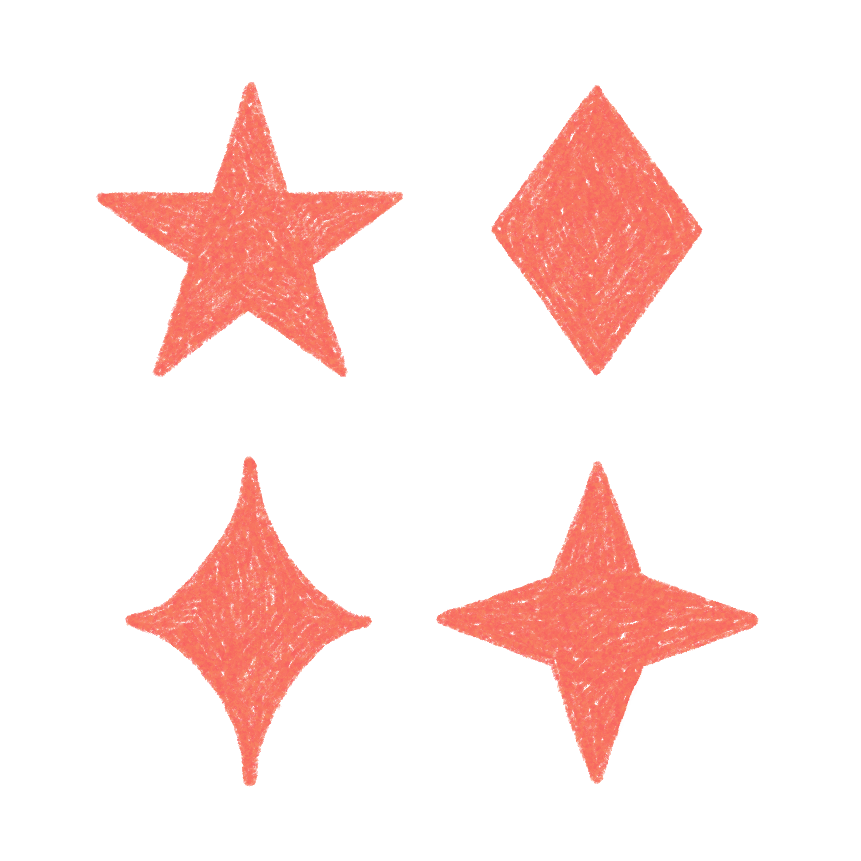 手描き風に色を塗って仕上げた、星の飾りのイラストです。普通の星、ダイヤ、きらきら、手裏剣みたいなのも。