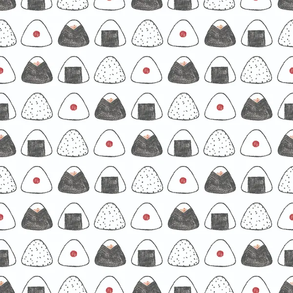 ちょっとざらざらしたブラシで描いたおにぎりのデザインです。海苔の巻き方もいろいろ、梅干しと鮭がアクセントです。