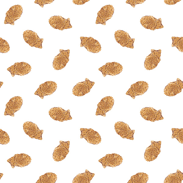 以前にもたい焼き柄をリリースしてもらいましたが、今回のデザインは、小さいサイズのたい焼きが並んだ柄です。あんこの色を先に置いてそのあとから、生地の色味でラフに仕上げています。